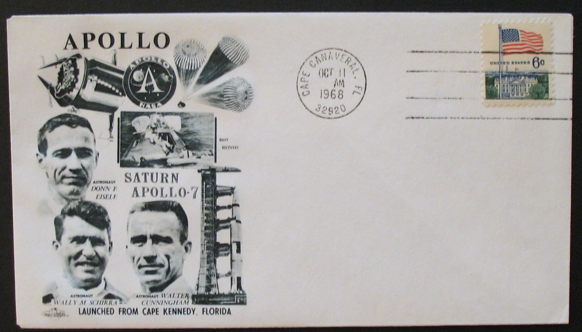cover / Donn F. Eisele, Waly M. Schirra and Walter Cunningham "CAPE CANAVERAL, FL. 32920 / OCT 11 AM 1968" |