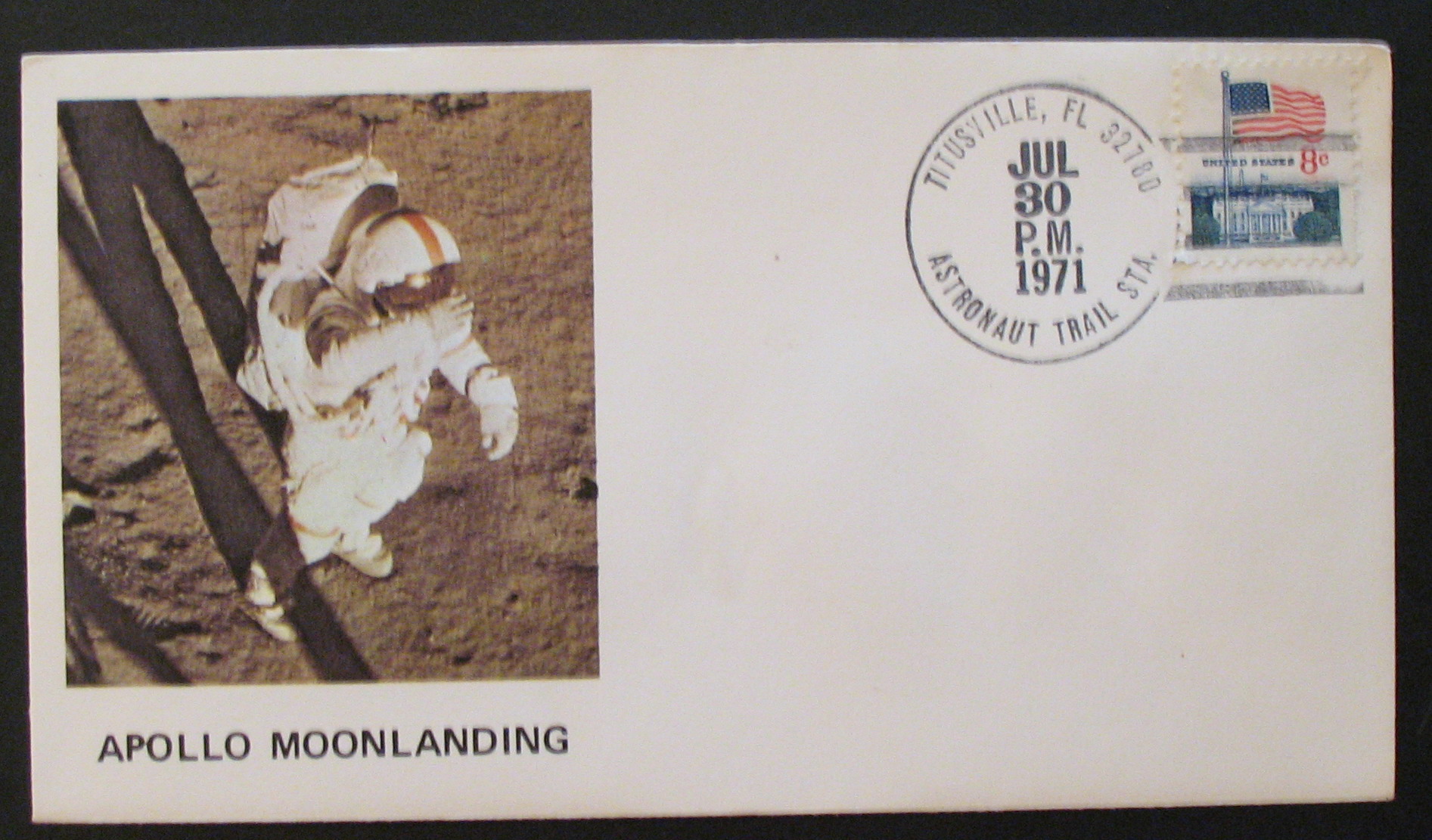 Landing / David Scott, Alfred Worden and James Irwin "TITUSVILLE, FL 32780 / ASTRONAUT TRAIL STA. / JUL 30 PM 1971" (Hand cancel) |