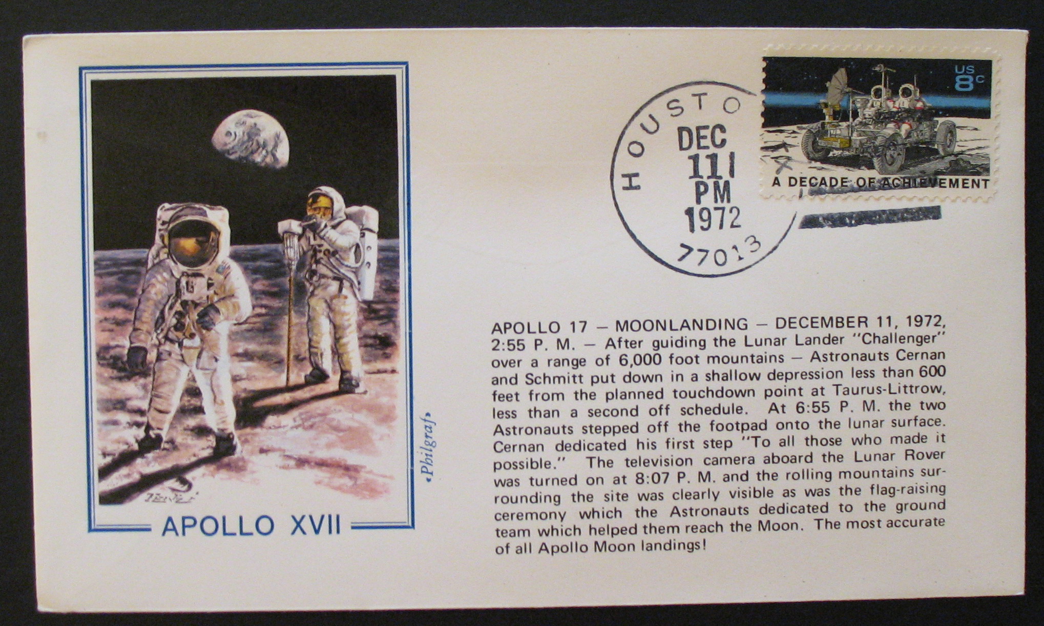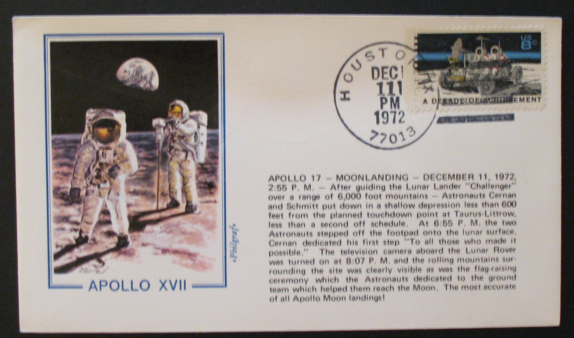 Landing / Eugene Cernan, Ronald Evans and Harrison Schmitt "HOUSTON TX 77013 / DEC 11 PM 1972" (Hand cancel) |