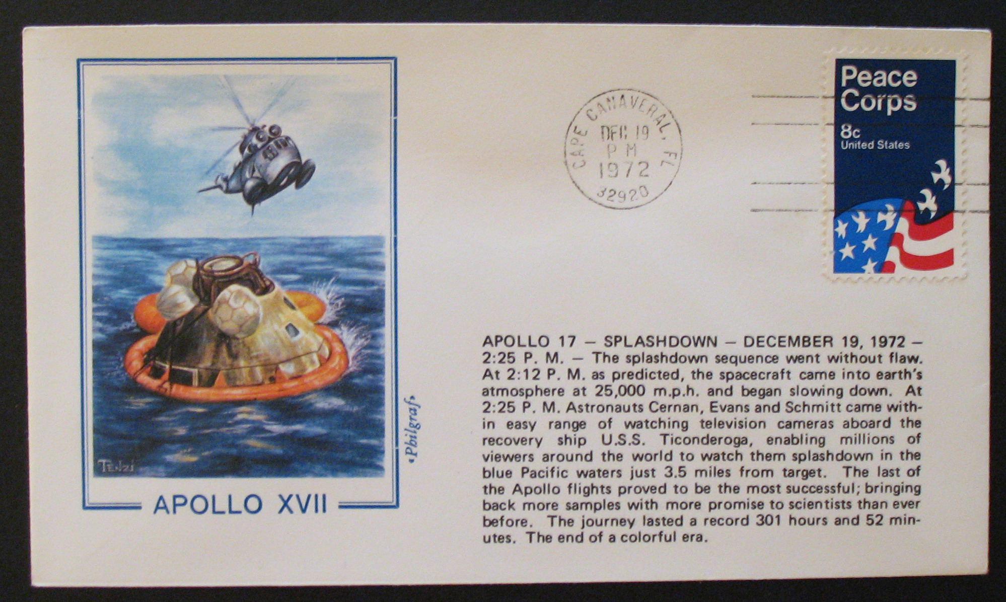 Splashdown - Recovery in the Pacific by crews of the U.S.S. Ticonderoga "CAPE CANAVERAL, FL. 32920 / DEC 19 PM 1972" |